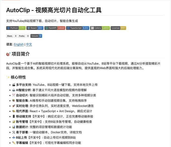 今天分享一个让我效率翻倍的 GitHub 项目:AutoClip。它能自动把长视频剪成多条短视频,我等于白捡了一个 AI 剪辑助理。