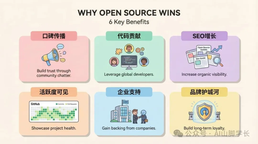 关键在于:开源不是技术选择,而是一种分发策略。在 AI 能写任何代码的 2026 年,代码本身已经不值钱了,值钱的是品牌和社区。