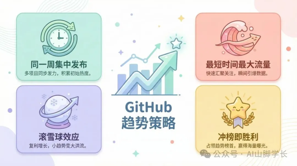 他的核心逻辑是:在最短时间内获得最大流量,冲上 GitHub Trending 榜